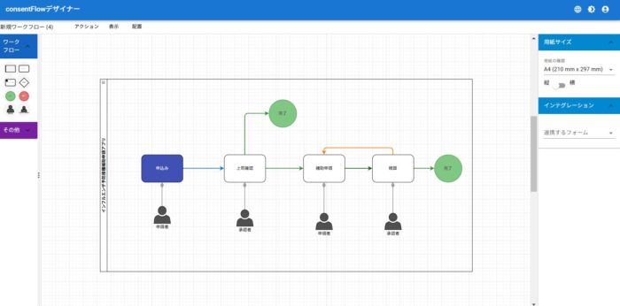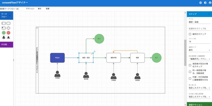 キャンバス上にイラストを描くだけで、ワークフローが設計できるため簡単です。人物のアイコンを押すとプロパティが表示されて、職位コードやユーザIDを紐づけることができます。
