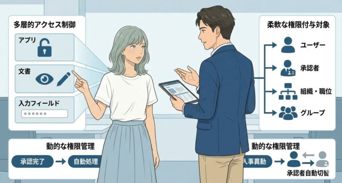 人事異動への自動対応: 人事異動などでワークフローの承認者が代わった場合、アクセス権限も自動的に新しい承認者へ切り替わります。